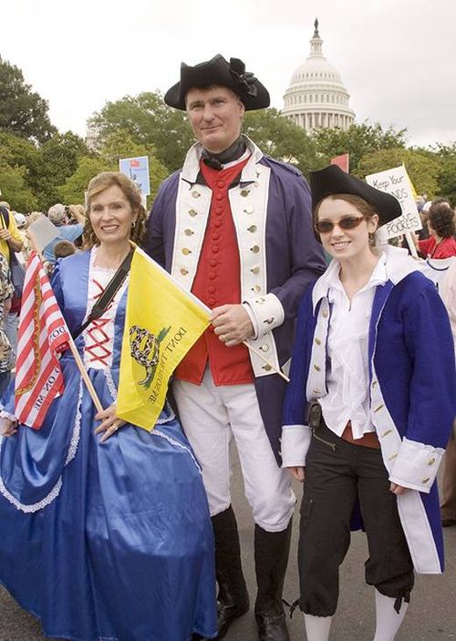 hat they are Nazi sympathizers. This event was wall to wall hammers and sickles and words like ‘socialist’ ‘communist’ and ‘Marxist’ etc. It continues to fascinate me how long the Democrats will tolerate this without ever commenting on it. Either they like it, or there’s something to it. Ever present at Tea Parties are Sons of Liberty reenactors. The couple on the left is from Tennessee and the young lady on the right is not but she joined in the photo. The clothing for the couple was hand stitched by the lady on the left. And boy do they love America.