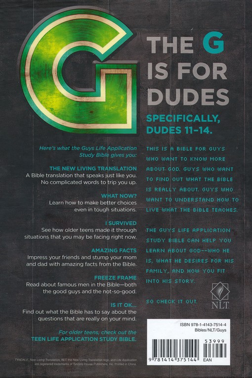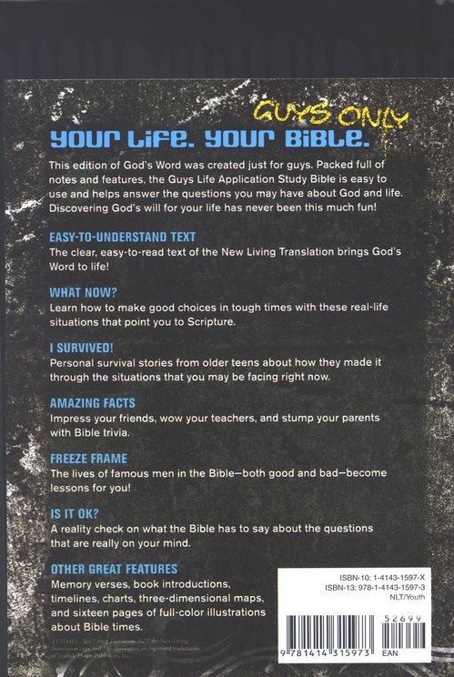 - NLT Guys Life Application Study Bible (glow in the dark version) – This one feels very up to date, uses the awesome NLT version, and has various styles, including Urban (with ‘non-white’ illustrations)
