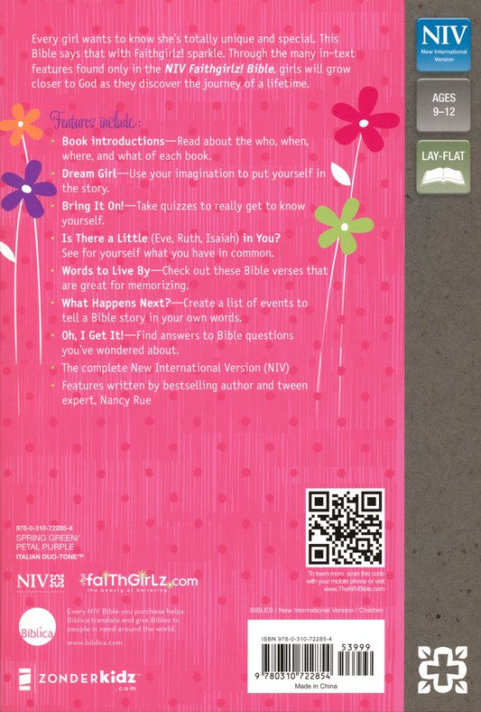 - NIV Faithgirlz! Bible – This is what I got for my 10 year old, she likes it, and I like that it has fill-ins and quizzes. Kids like.